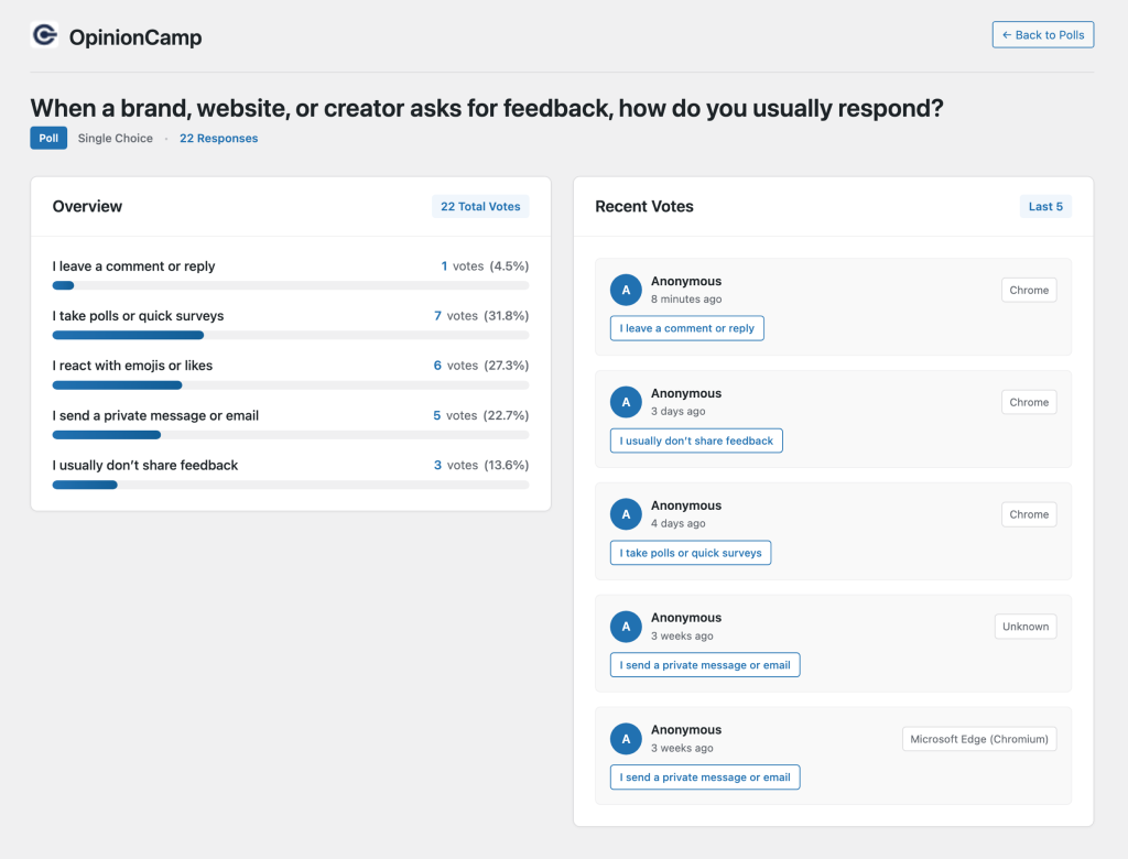 OpinionCamp will eventually grow into a full feedback suite with surveys, reactions, ratings, quizzes, and more.