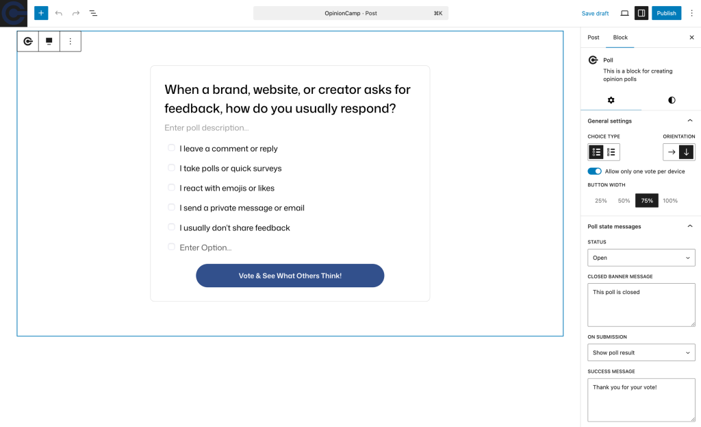So we built OpinionCamp — a truly block-based poll plugin designed for speed, simplicity, and better user engagement.